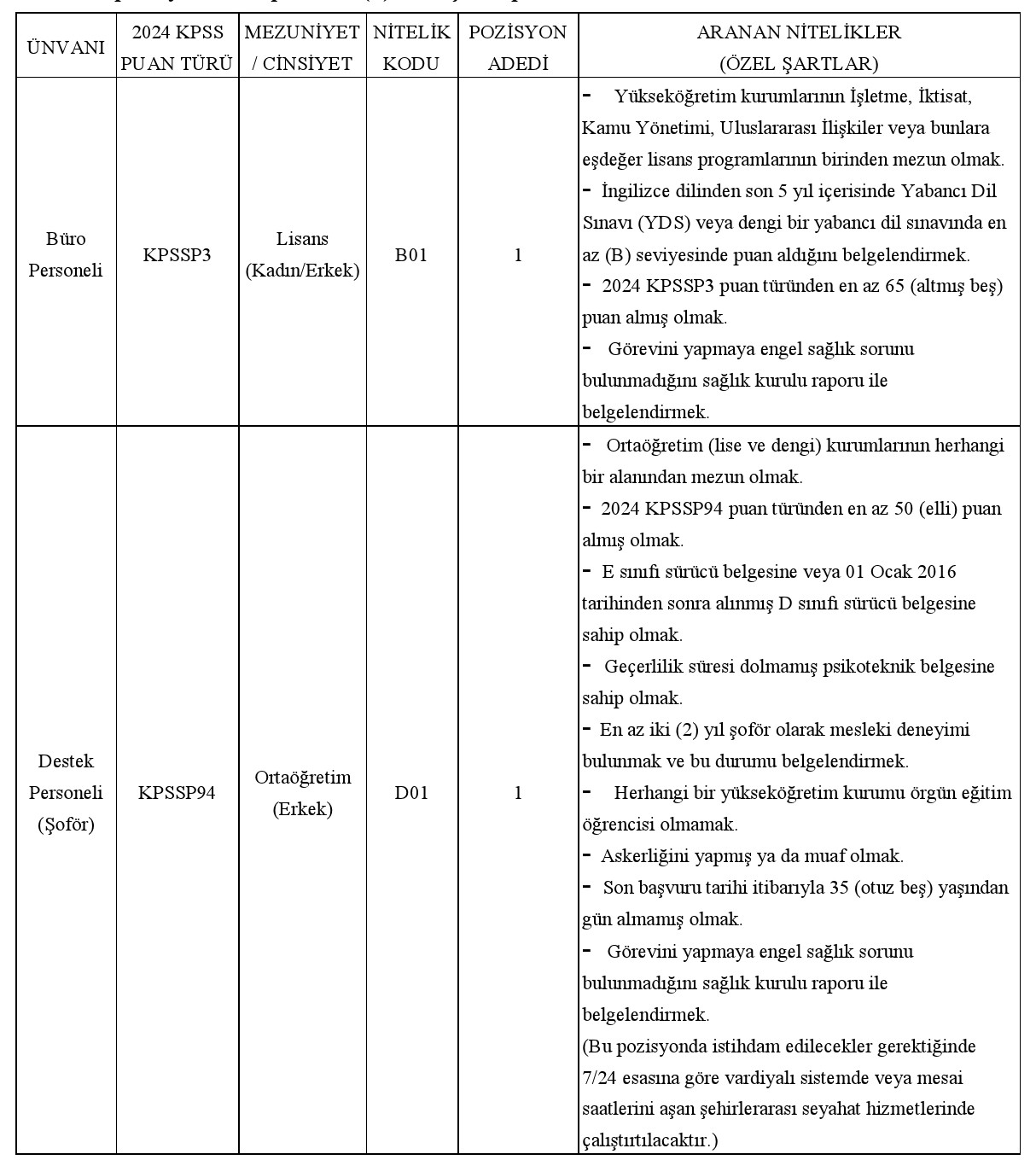 Üniversitemiz Rektörlüğü bağlı birimlerinde, 657 sayılı Devlet Memurları Kanunu'nun 4'üncü maddesinin (B) fıkrasına göre istihdam edilmek ve giderleri özel bütçeden karşılanmak üzere 06.06.1978 tarihli ve 7/15754 sayılı Bakanlar Kurulu Kararı ile yürürlüğe konulan "Sözleşmeli Personel Çalıştırılmasına İlişkin Esaslar" gereği; genel ve özel şartları taşıyanlar arasından, 2024 KPSS (B) grubunun ilgili puan türünde sıralama esas alınmak suretiyle aşağıda belirtilen pozisyonlara toplam iki (2) sözleşmeli personel alınacaktır.