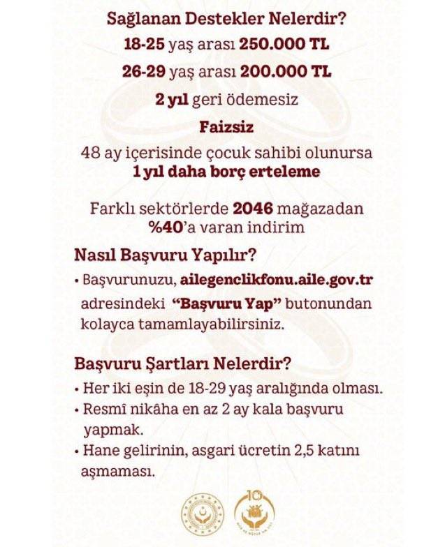 Başvuruların ailegenclikfonu.aile.gov.tr adresinden yapılabileceği belirtilen paylaşımda, başvuru şartları da sıralanarak, "her iki eşin de 18-29 yaş aralığında olması" ve "resmi nikaha en az 2 ay kala başvuru yapılması" gerektiği belirtildi. Ayrıca, hane gelirinin, asgari ücretin 2,5 katını aşmaması da şartlar arasında yer aldı.