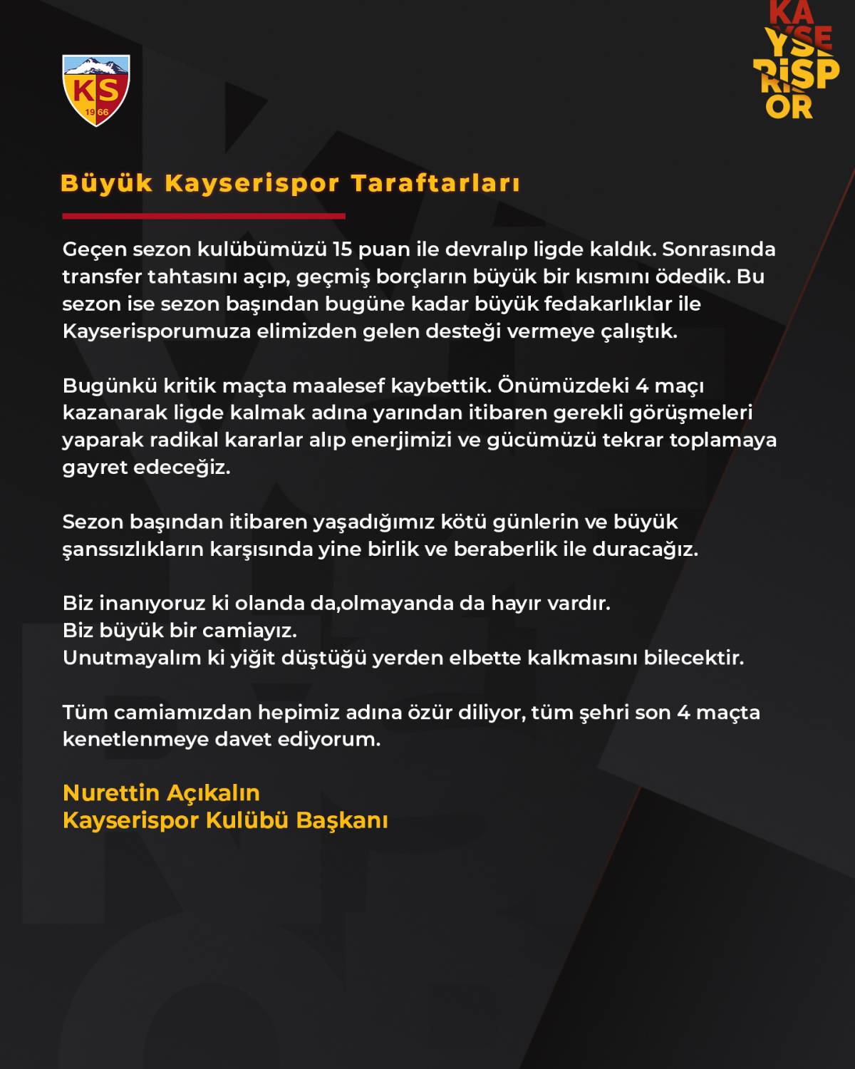 "Geçen sezon kulübümüzü 15 puan ile devralıp ligde kaldık" diyen Başkan AÇıkalın taraftara seslenerek radikal kararlar alacaklarını kaydetti.