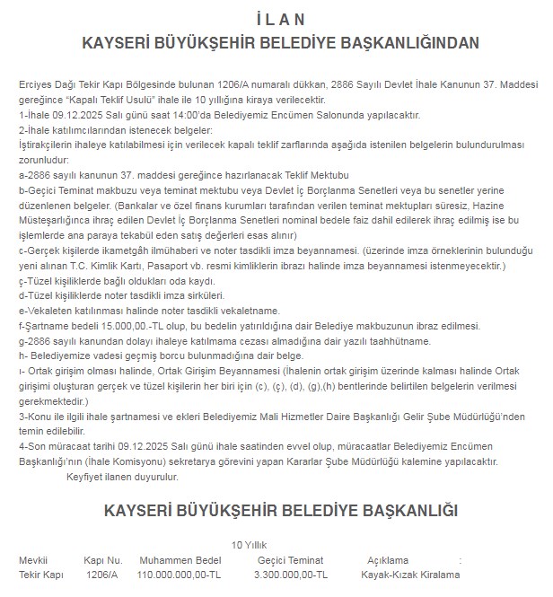Kayseri Büyükşehir Belediyesi Erciyes'te Tekir kapı bölgesinde bulunan bir dükkanı ihaleyle kiraya verecek.