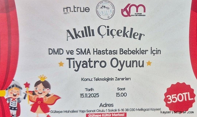 'Kayseri İyilik Abisi Derneği' tarafından 'Akıllı Çiçekler' tiyatro oyunu 15 Kasım Cumartesi günü saat 15.00'te Gültepe Kültür Merkezi'nde sahnelenecek. Hayırseverler tarafından satın alınacak oyun biletleri sayesinde şehit çocukları, yetim, öksüz ve ihtiyaç sahibi çocuklar oyunu ücretsiz olarak izleyebilecek.