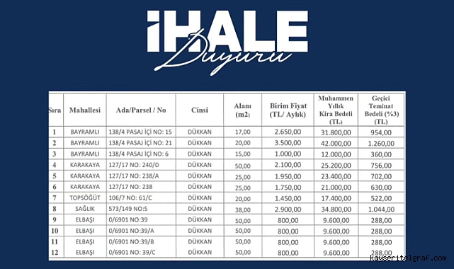 Bünyan Belediyesi mülkiyetinde yer alan 12 adet taşınmaz, açık teklif usulü ile satışa çıktı. Söz konusu ihale, 24.12.2025 tarih ve saat 16.00'da düzenlenecek ve taşınmazlar tek tek kiralanacak.