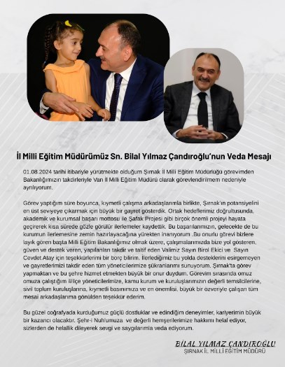 Buna göre Kayserili olan ve bir dönem Kayseri'de de görev yapan Şırnak Milli Eğitim Müdürü Bilal Yılmaz Çandıroğlu, Van Milli Eğitim Müdürlüğü'ne atandı.