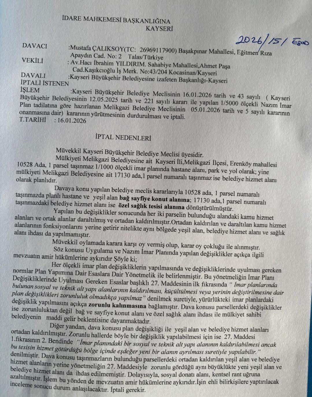 Kayseri Büyükşehir Belediyesi Meclisi'nde yapılan imar planı değişikliklerine karşı çıkan CHP’li Meclis Üyesi Mustafa Çalıksoy, kamu yararının ihlal edildiği gerekçesiyle idari yargıya başvurdu.