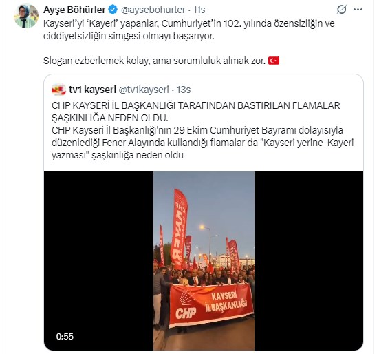 CHP Kayseri İl Başkanlığı'nın 29 Ekim Cumhuriyet Bayramı kapsamında düzenlediği yürüyüşte açılan flamalarda 'Kayseri' yerine 'Kayeri' yazdığı görülmüştü.