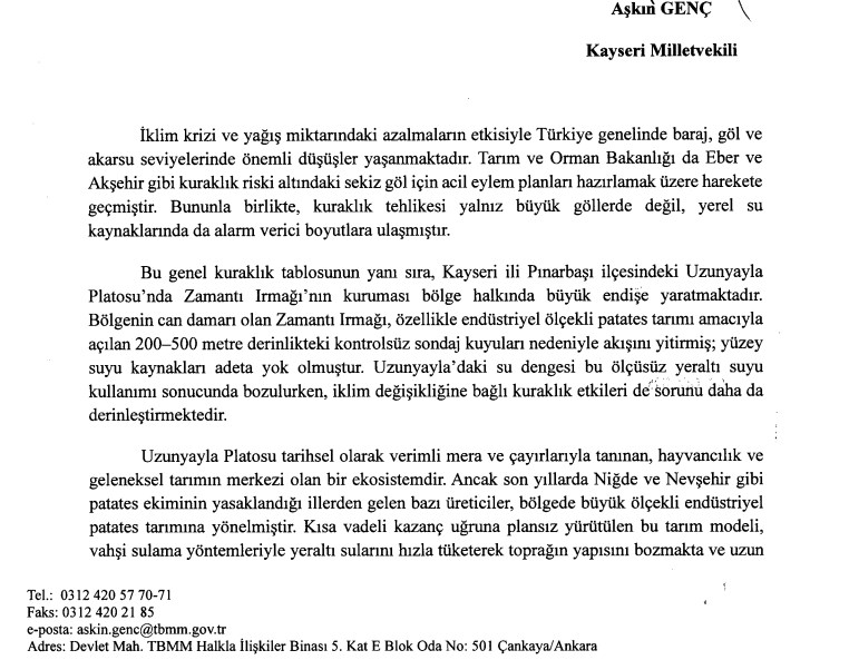 CHP Kayseri Milletvekili Aşkın GEnç, Pınarbaşı ilçei uzunyayla'da bulunan su kaynaklarının korunmaı makadıyla soru önergesi verdi.