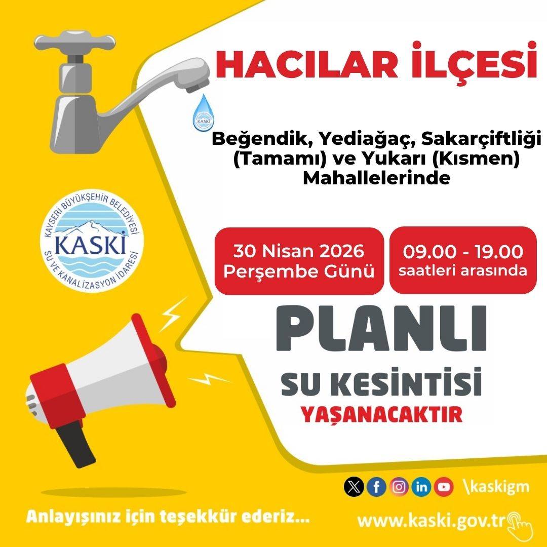 Kayseri Su ve Kanalizasyon İdaresi Genel Müdürlüğü'nden yapılan açıklamaya göre yarın (30 Nisan Perşembe) Hacılar ilçesindeki bazı mahallelerde su kesintisi yaşanacak.