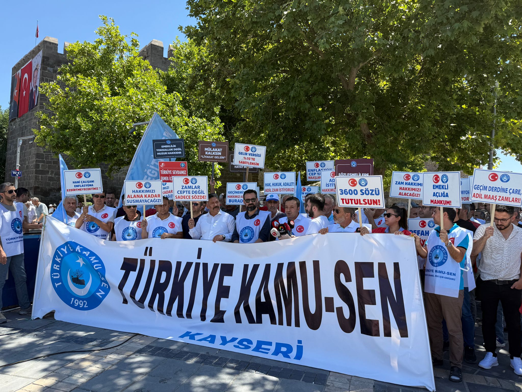 Türkiye Kamu-Sen tarafından Türkiye genelinde eşzamanlı olarak basın açıklaması düzenlendi. Kayseri Cumhuriyet Meydanı’nda düzenlenen açıklamada konuşan Kayseri Kamu Sen İl Temsilcisi Ramazan Sıdar, “Kamu İşvereni, teklifini gözden geçirmek ve gerçekçi bir artış önerisi sunmak zorundadır” dedi.