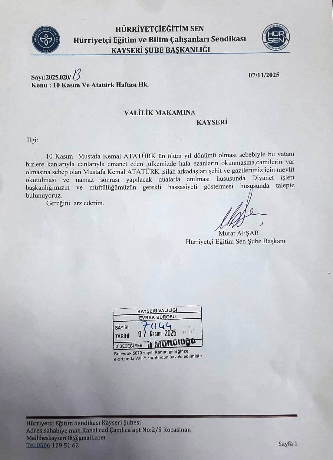 Kayseri Hürriyetçi Eğitim Sendikası, Kayseri Valiliğine dilekçe ile 10 Kasım 2025 tarihinde Camilerde Mustafa Kemal Atatürk, şehitler ve gaziler için mevlit okutulmasını ve namaz sonrası yapılacak dualarla anılması için talepte bulundu.