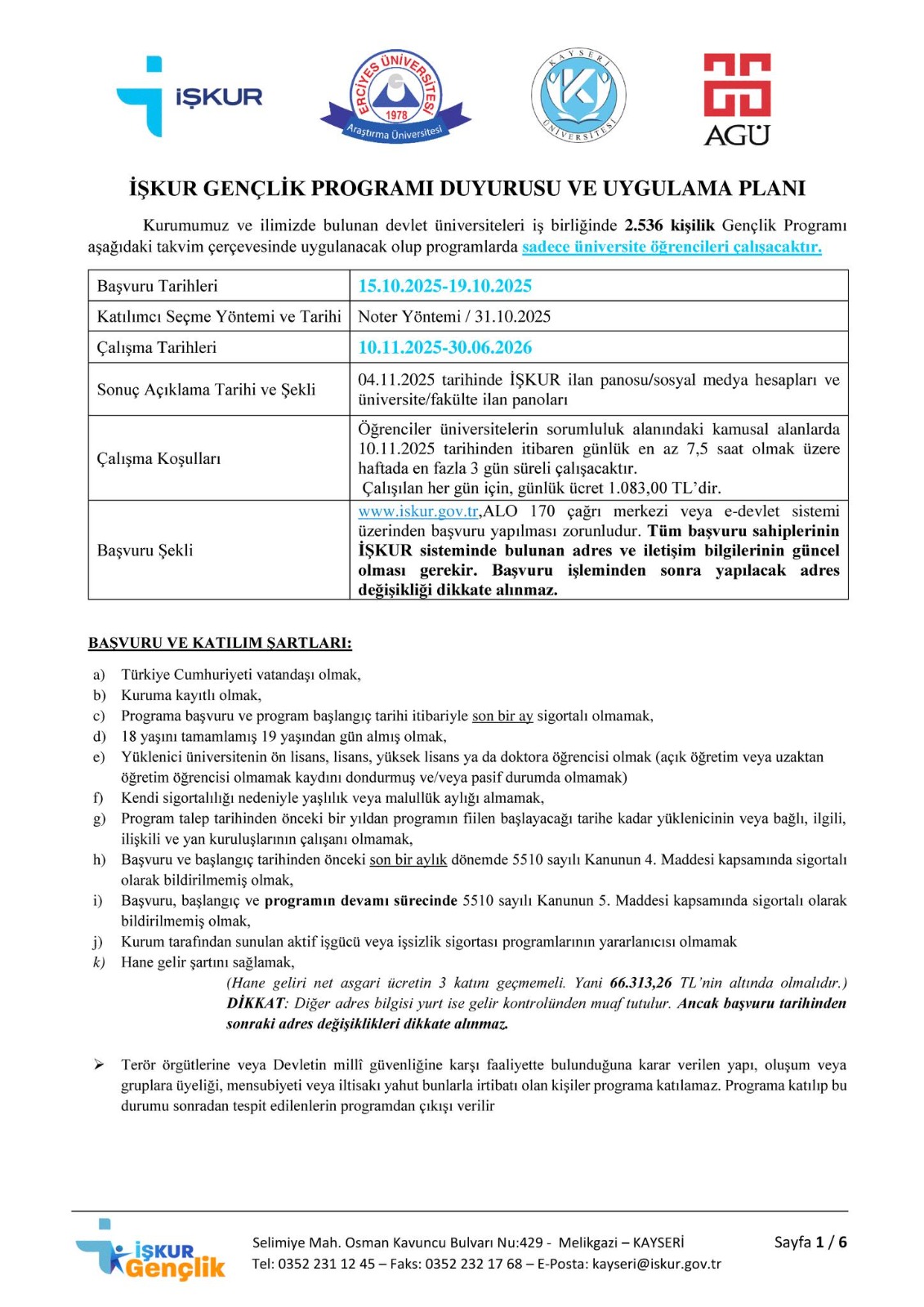 İŞKUR Kayseri, yalnızca üniversite öğrencilerinin çalışacağı İŞKUR Gençlik Programı başvurularının başladığını duyurdu. Program kapsamında öğrenciler üniversitelerin sorumluluk alanındaki kamusal alanlarda 10 kasım gününden itibaren günlük en az 7,5 saat olmak üzere haftada en fazla 3 gün süreli çalışacak. Çalışılan her gün için, günlük ücret 1.083,00 TL olarak belirlendi. Başvurular ise www.iskur.gov.tr, ALO 170 çağrı merkezi veya e-devlet sistemi üzerinden yapılacak. Yapılan açıklamada başvuruya katılım şartları ise şu şekilde açıklandı, “Türkiye Cumhuriyeti vatandaşı olmak, kuruma kayıtlı olmak, programa başvuru ve program başlangıç tarihi itibariyle son bir ay sigortalı olmamak, 18 yaşını tamamlamış 19 yaşından gün almış olmak, yüklenici üniversitenin ön lisans, lisans, yüksek lisans ya da doktora öğrencisi olmak (açık öğretim veya uzaktan öğretim öğrencisi olmamak kaydını dondurmuş ve/veya pasif durumda olmamak), kendi sigortalılığı nedeniyle yaşlılık veya malullük aylığı almamak, program talep tarihinden önceki bir yıldan programın fiilen başlayacağı tarihe kadar yüklenicinin veya bağlı, ilgili, ilişkili ve yan kuruluşlarının çalışanı olmamak, başvuru ve başlangıç tarihinden önceki son bir aylık dönemde 5510 sayılı Kanunun 4. Maddesi kapsamında sigortalı olarak bildirilmemiş olmak, başvuru, başlangıç ve programın devamı sürecinde 5510 sayılı Kanunun 5. Maddesi kapsamında sigortalı olarak bildirilmemiş olmak, kurum tarafından sunulan aktif işgücü veya işsizlik sigortası programlarının yararlanıcısı olmamak, hane gelir şartını sağlamak, (Hane geliri net asgari ücretin 3 katını geçmemeli. Yani 66.313,26 TL'nin altında olmalıdır.) Diğer adres bilgisi yurt ise gelir kontrolünden muaf tutulur. Ancak başvuru tarihinden sonraki adres değişiklikleri dikkate alınmaz. Terör örgütlerine veya Devletin milli güvenliğine karşı faaliyette bulunduğuna karar verilen yapı, oluşum veya gruplara üyeliği, mensubiyeti veya iltisakı yahut bunlarla irtibatı olan kişiler programa katılamaz. Programa katılıp bu durumu sonradan tespit edilenlerin programdan çıkışı verilir."