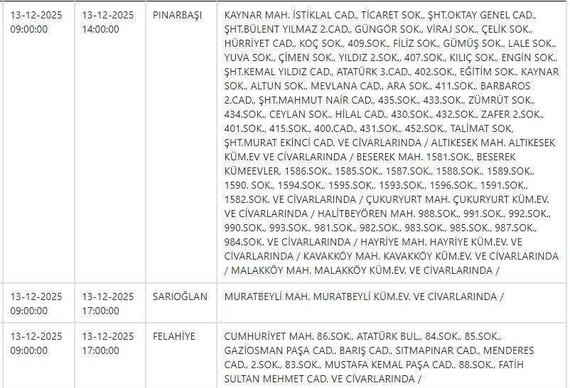 Özel Haber Yayınlanma: 12 Aralık 2025 - 12:31 İşte yarın Kayseri'de elektrik kesintisi yapılacak ilçe ve mahalleler Özel Haber 12 Aralık 2025 - 12:31 Yorumlar Yazdır A Büyüt A Küçült Yorumlar Kayseri ve Civarı Elektrik Türk Anonim Şirketi (KCETAŞ), vatandaşları yaşanacak elektrik kesintilerine ilişkin uyardı. Buna göre yarın (13 Aralık) bir çok ilçede elektrik kesintisi yaşanacak.İşte o ilçe ve mahalleler; YORUMLAR adlı kullanıcıya cevap x Gönder İlginizi Çekebilir Yarın Talas ve Yeşilhisar'da elektrik kesinitisi yaşanacak CHP'li Pala, Kayseri'de yalnız bir firmayla çalışılmasını sordu Yarın Talas'ta elektrik kesintisi var MHP'li Meclis Üyesi Yeniay'ın acı günü Son Haberler 'Beleş Tepe'de kayak keyfi sürüyor Savcı, kadın hakimi duruşmada vurdu 'Mustafa Elitaş Bulvarı'na bir tepki de Eryılmaz'dan Sarız'da karısını öldüren sanığa hapis! Erciyes'te kar kalınlığı bir buçuk metreyi geçti Çok Okunan Haberler Hisarcık'taki kavgada yaralanan genç kurtarılamadı Argıncık'ta bir kadın evinde ölü bulundu 17 Aralık şehitlerimiz için anma töreni düzenlendi Son Yorumlananlar Kay Tv ve Kay Radyo'nun yeni sahibi Açıkgöz oldu Büyükşehir Belediyesi Erciyes'te iki dükkanı kiraya verecek Vali Çiçek'ten CHP Milletvekili Genç'e yanıt Ev taşıma pazarlığı kanlı bitti Ev taşıma pazarlığı kanlı bitti
