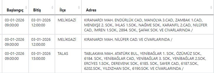 Kayseri ve Civarı Elektrik Türk Anonim Şirketi (KCETAŞ), vatandaşları yaşanacak elektrik kesintilerine ilişkin uyardı. Buna göre yarın (3 Ocak)Melikgazi ve Talas ilçelerinde elektrik kesintisi yaşanacak.