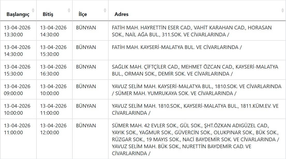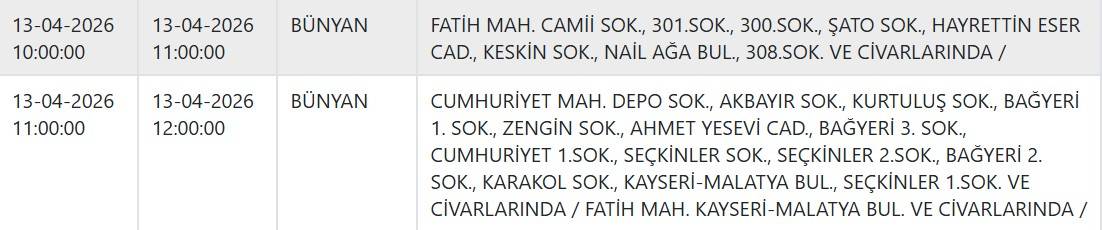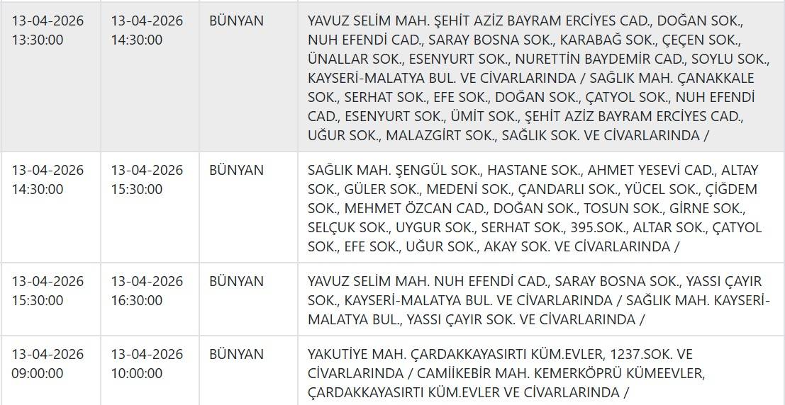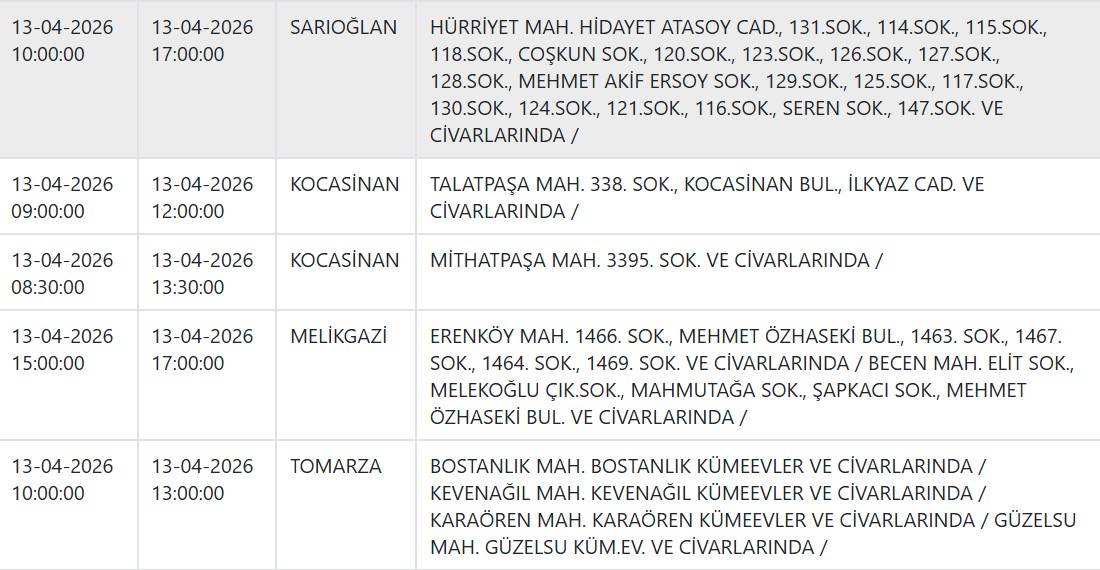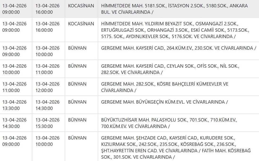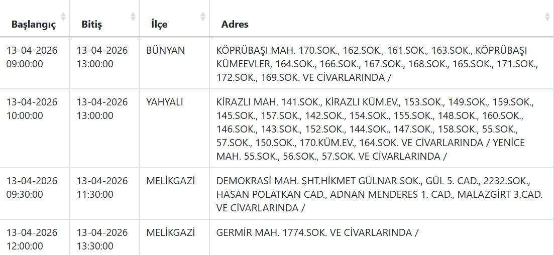 Kayseri ve Civarı Elektrik Türk Anonim Şirketi (KCETAŞ), vatandaşları yaşanacak elektrik kesintilerine ilişkin uyardı. Buna göre yarın (13 Nisan) bir çok ilçede elektrik kesintisi yaşanacak.