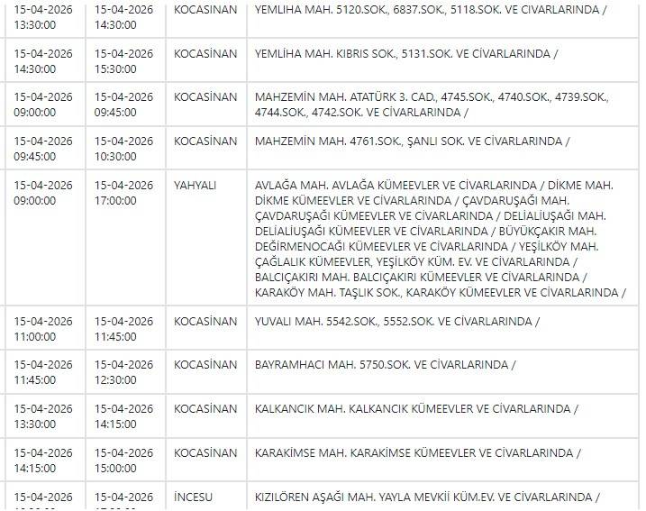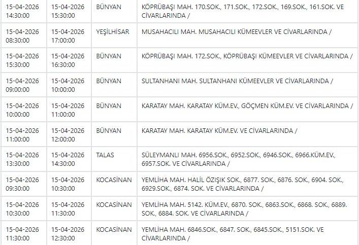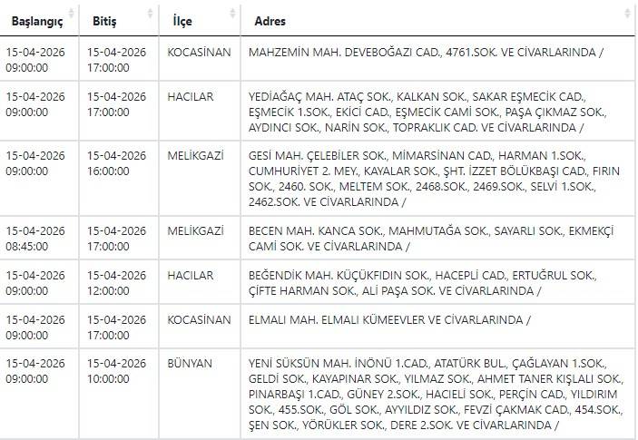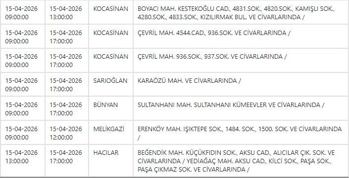 Kayseri ve Civarı Elektrik Türk Anonim Şirketi (KCETAŞ), vatandaşları yaşanacak elektrik kesintilerine ilişkin uyardı. (15 Nisan)