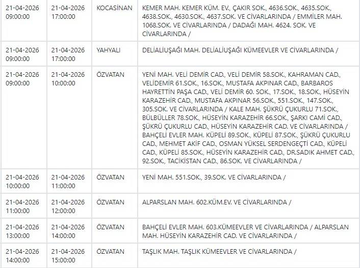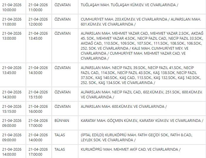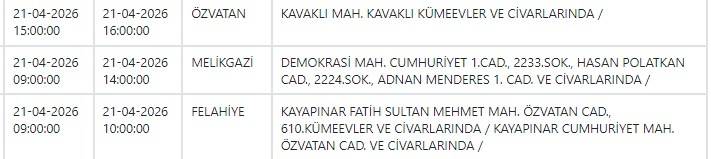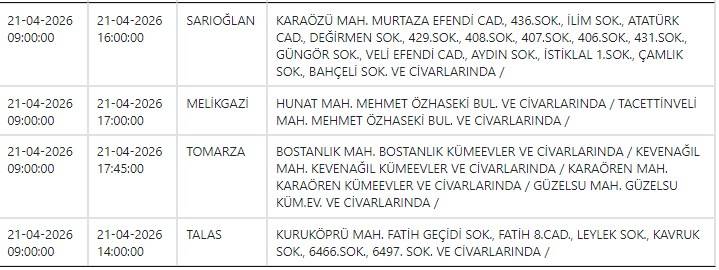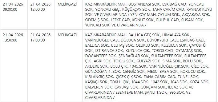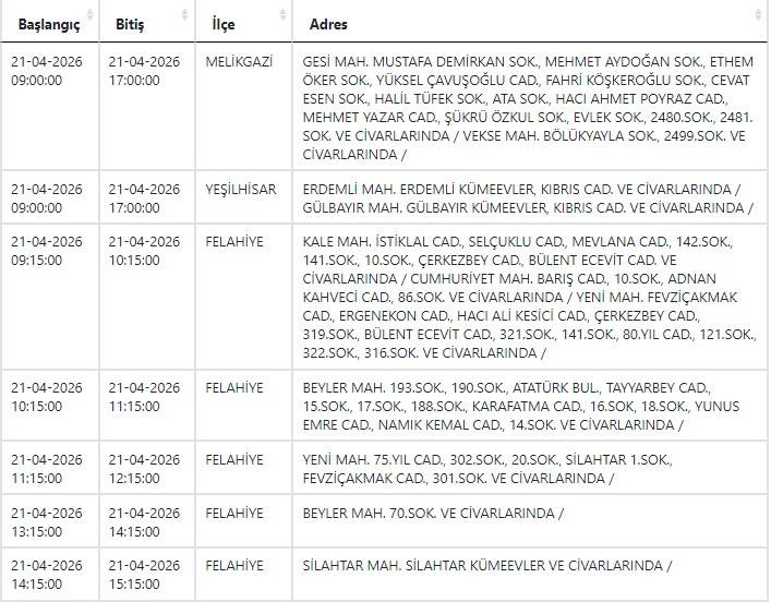 Kayseri ve Civarı Elektrik Türk Anonim Şirketi (KCETAŞ), vatandaşları yaşanacak elektrik kesintilerine ilişkin uyardı. Buna göre yarın (21 Nisan) bir çok ilçede elektrik kesintisi yaşanacak.