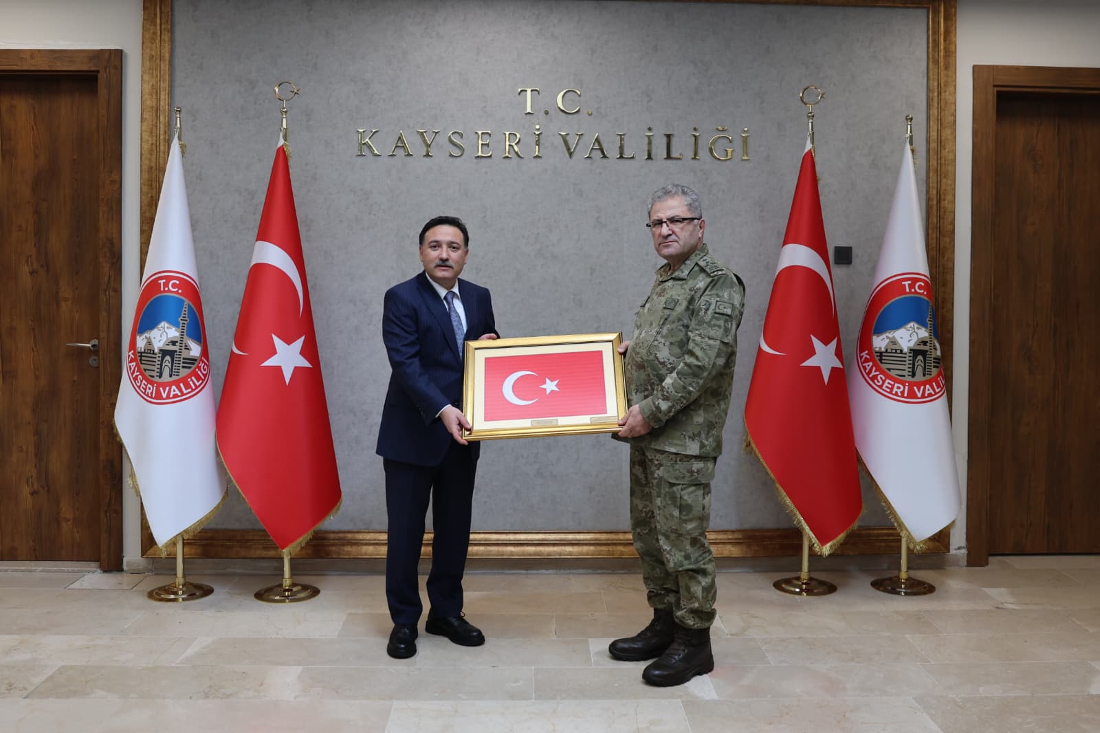 Kara Kuvvetleri Komutanı Orgeneral Metin Tokel ile Milli Savunma Bakan Yardımcısı Salih Ayhan Kayseri’ye geldi. Tokel ve Ayhan, Vali Gökmen Çiçek’e ziyaret gerçekleştirdi. Ziyarette, il genelinde yürütülen çalışmalar ile devam eden projelere ilişkin karşılıklı görüş alışverişinde bulunuldu. Vali Gökmen Çiçek, nazik ziyaretlerinden dolayı Kara Kuvvetleri Komutanı Orgeneral Metin Tokel ve Milli Savunma Bakan Yardımcısı Salih Ayhan’a teşekkür ederek, görevlerinde başarılar diledi.
