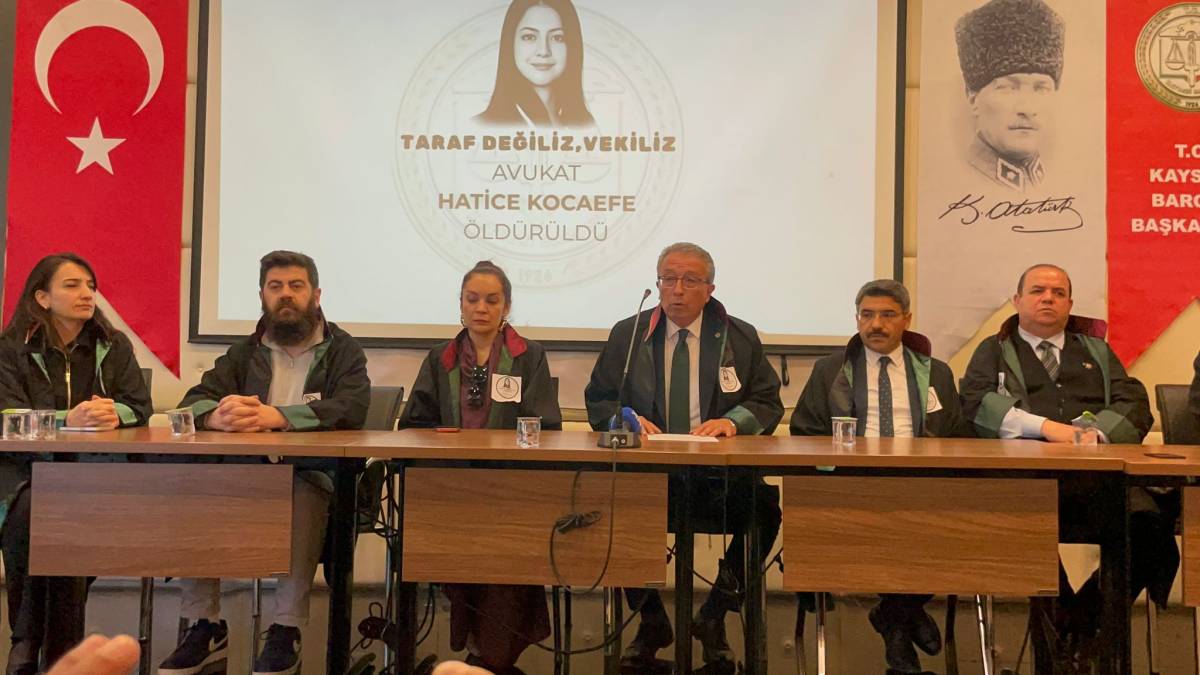 Bursa’nın Gürsu ilçesinde alacak verecek davası nedeniyle çıktığı öne sürülen olayda genç avukat Hatice Kocaefe, silahla ateş edilme sonucu hayatını kaybetmişti. Kayseri Adliyesi'ndeki Baro Başkanlığı Toplantı Salonu'nda Kayseri Barosu yönetimi ve avukatlar olaya tepki gösterdi.