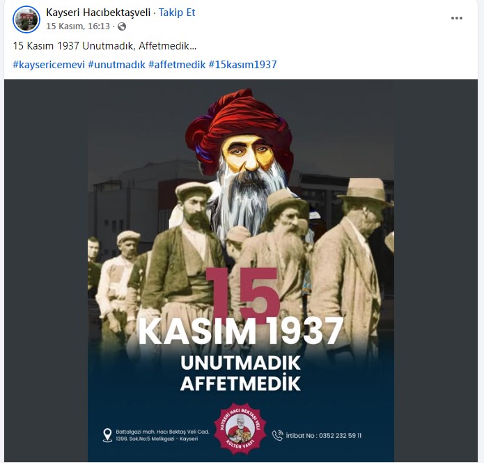 Kayseri Hacı Bektaş-ı Veli Cem Evi'nin sosyal medya hesabından yapılan ve tepki çeken paylaşımda "15 Kasım 1937... Unutmadık... Affetmedik" denildi.