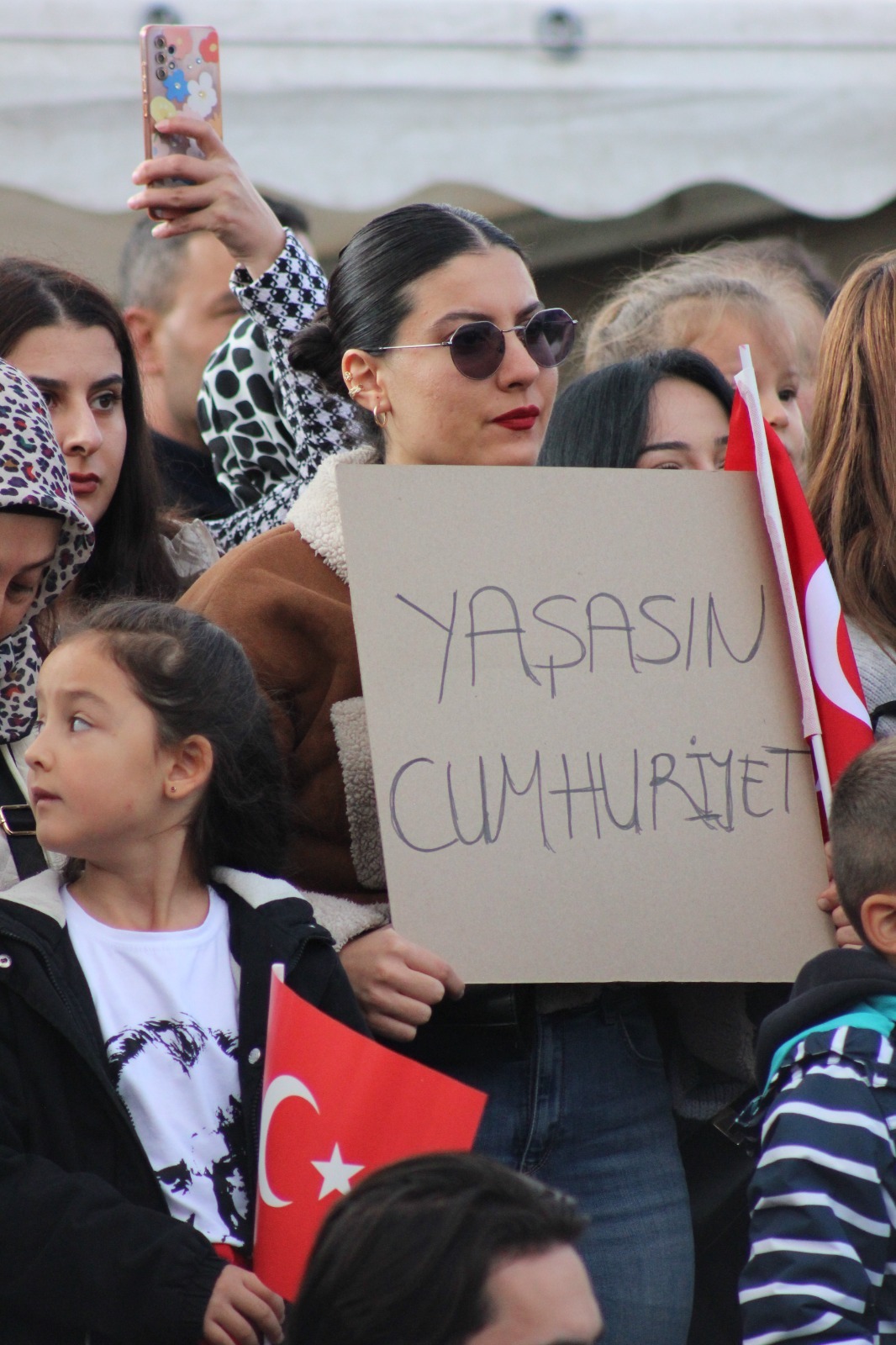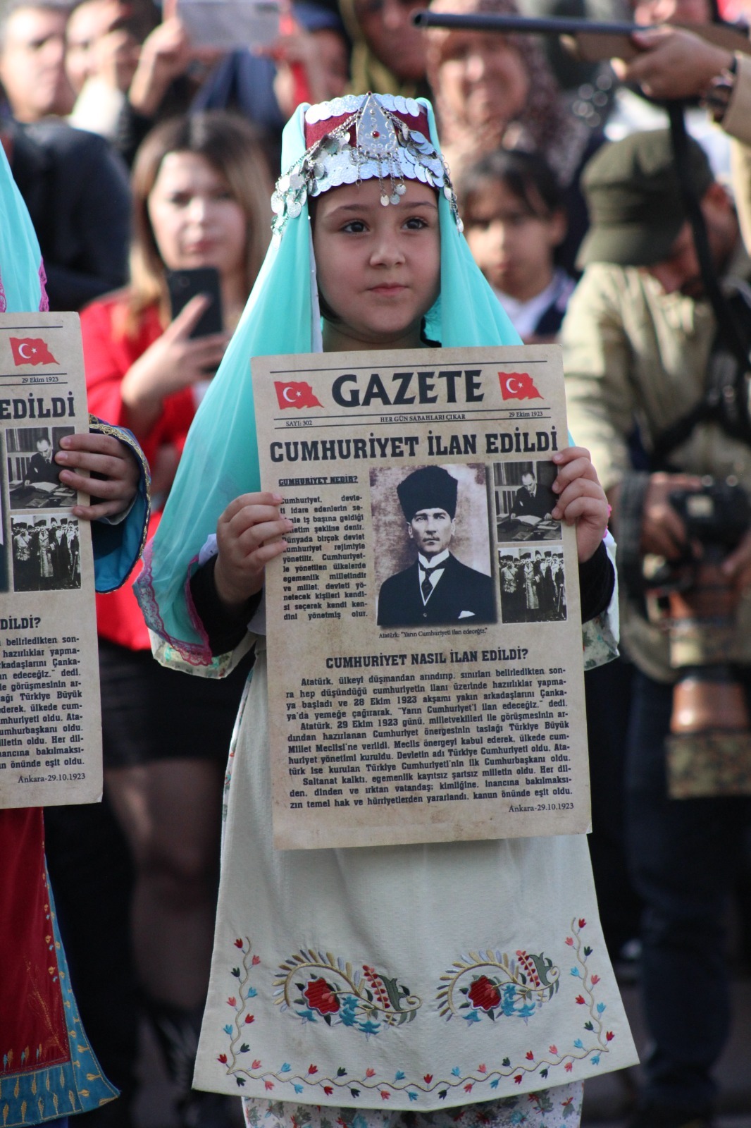 Çiçek, "Değerli hemşehrilerim, bizim tarihimizde utanılacak, başımızı yere eğecek tek bir an, tek bir sahne, tek bir olay yoktur. Biz, ecdadımızla gurur duyan, alnı dik gezen bir milletiz. 102 yıl önce kapkaranlık zamanlar yaşadık. Dört bir yandan ülkemizi parçalamak için saldırmışlardı. Vatanımızın dört bir yanı işgal altındaydı. Karanlıktı. Milletimiz yorgun düşmüştü. Ama Gazi Mustafa Kemal Atatürk, milletiyle kenetlenerek, köy köy, mahalle mahalle, sokak sokak, kasaba kasaba, şehir şehir bağımsızlık meşalesini yakarak, milletiyle el ele karanlıkları yırtarak milletimizi tekrar aydınlığa çıkardı. Buradan meydan okuyoruz. Kayseri'nin bu meydanından şunu söylüyoruz: Biz bu coğrafyaya diz çökmek için değil, dimdik ayakta durmak için yemin ettik. Ve her şeye rağmen bu coğrafyada hep var olacağız. Sadece kendimiz için değil, mazlumlar için de var olacağız. Bu duygularla başta Gazi Mustafa Kemal Atatürk olmak üzere, tüm gazilerimizi, şehitlerimizi rahmetle anıyorum. Her birinize saygılar sunuyorum. Cumhuriyet Bayramımız kutlu olsun!" diye konuştu.