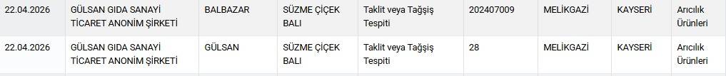 Tarım ve Orman Bakanlığı tarafından taklit veya tağşiş yaptığı belirlenen firmalar listesinde Kayseri’de gıda sektöründe faaliyet gösteren firmanın 2 ürünü yer aldı. Firmalar ve belirlenen uygunsuzluklar ise şu şekilde; Gülsan Gıda Sanayi Ticaret Anonim şirketine ait ‘Balbazar’ markasının ‘Süzme Çiçek Balı’ ürününde taklit veya tağşiş yapıldığı tespit edildi. Ayrıca yine ‘Gülsan Gıda Sanayi Ticaret Anonim şirketine ait Gülsan markası adı altında üretilen ‘Süzme Çiçek Balı’ ürününde de taklit ve tağşiş yapıldığı belirlendi.
