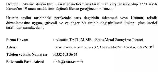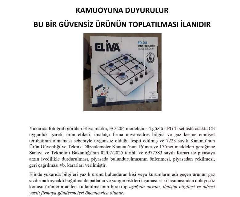 Kayseri Sanayi ve Teknoloji İl Müdürlüğü tarafından yapılan denetimler neticesinde Kayserili firma 'Erato Metal' tarafından satılan 'ELİVA' marka set üstü ocak için toplatma kararı çıktı.