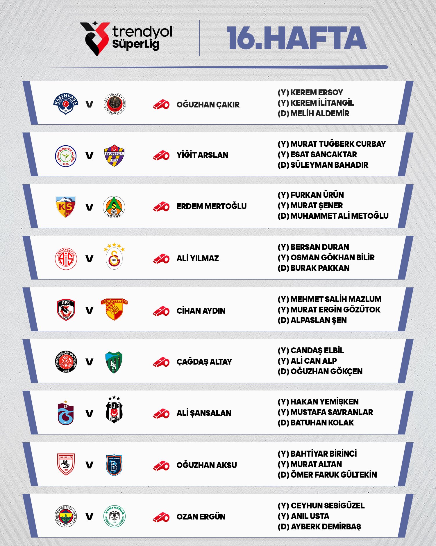 Maçların hakem listesi şöyle;