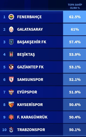 Kayserispor ise yüzde 50,6 topa sahip olma oranıyla sekizinci sırada bulunuyor.
