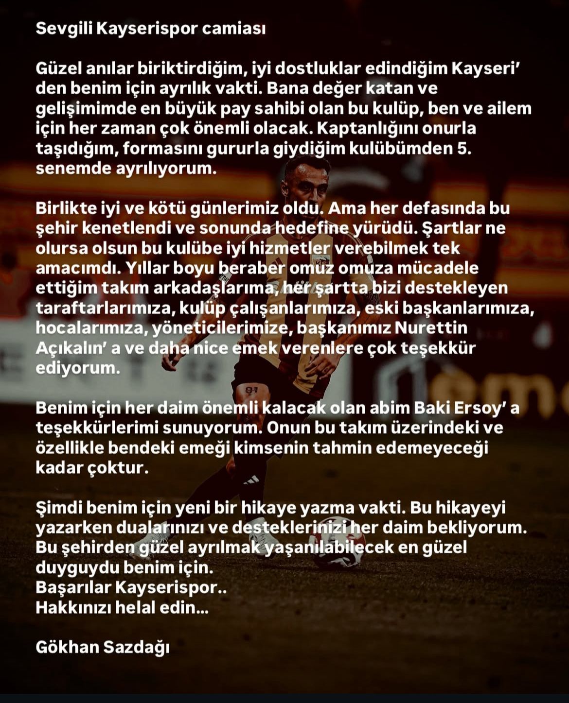 Gökhan son olarak Kayserispor camiası için bir teşekkür mesajı yayınladı.
