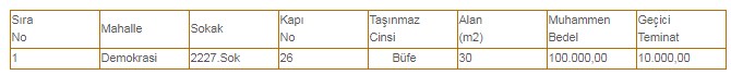 "Mülkiyeti Belediyemize ait aşağıda bilgileri sunulan taşınmaz 03 Şubat 2026 tarihinde 2886 sayılı Devlet İhale Kanunu’nun 45. maddesine istinaden Açık Teklif Usulüyle (3) üç yıllığına kiraya verilecek olup listede bulunan muhammen bedelle bir yıllık kira bedeli için belirlenmiştir.