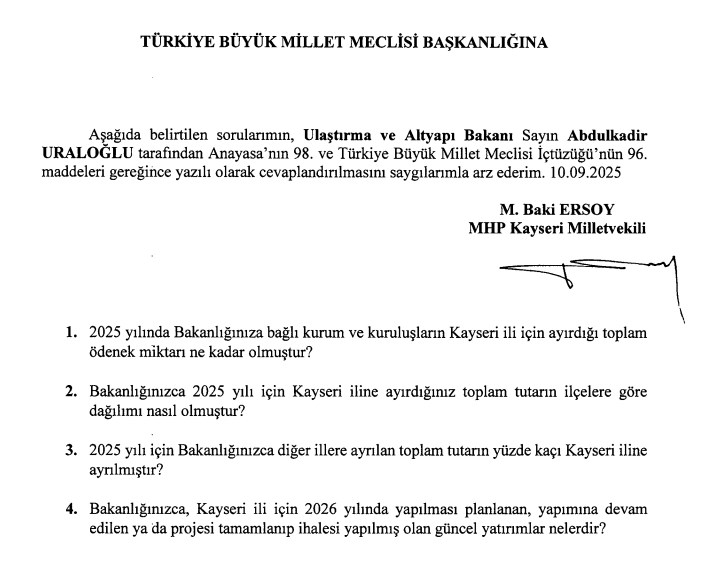 MHP Kayseri Milletvekil Baki Ersoy verdiği yazılı soru önergesinde Ulaştırma ve Altyapı Bakanlığı tarafından 2025 ve 2026 yıllarında Kayseri'ye ayrılan ödeneği sordu.