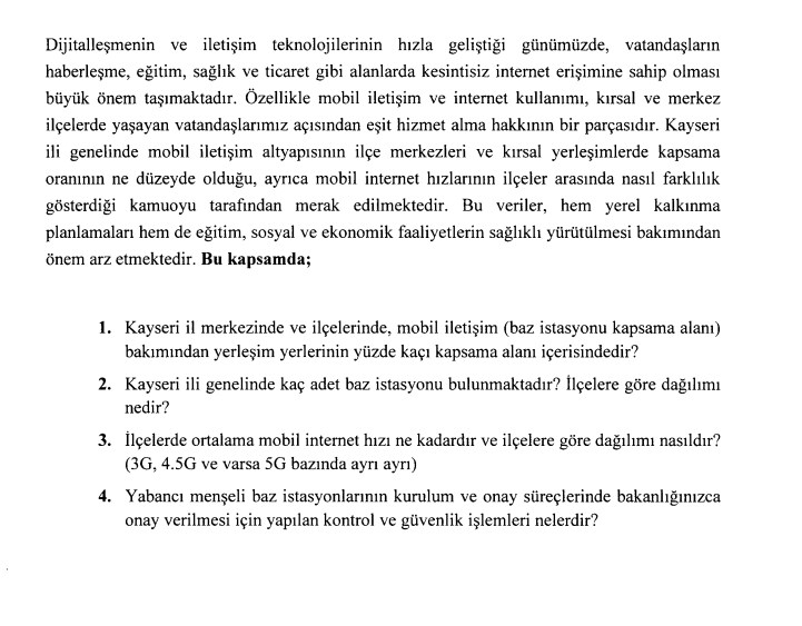 MHP Genel Başkan Yardımcısı ve Kayseri Milletvekili İsmai Özdemir, Bakan Abdulkadir Uraloğlu'na Kayseri'deki baz istasyonlarının sayısını sordu.