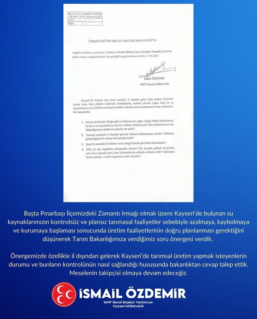 MHP Genel Başkan Yardımcısı ve Kayseri Milletvekili İsmail Özdemir, Zamantı Irmağı başta olmak üzere, Kayseri'deki su kaynaklarının kullanımına ilişkin soru önergesi verdi.