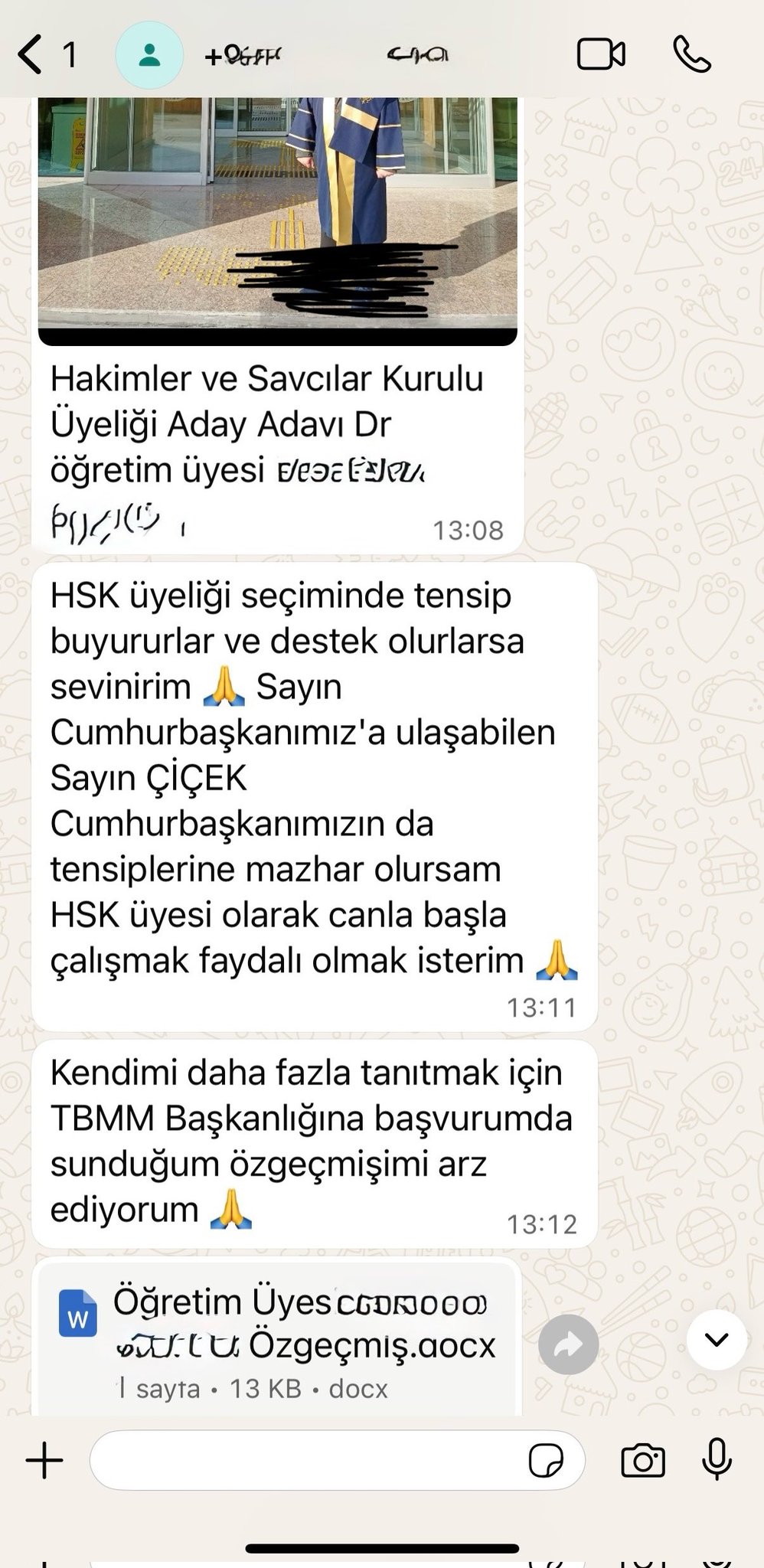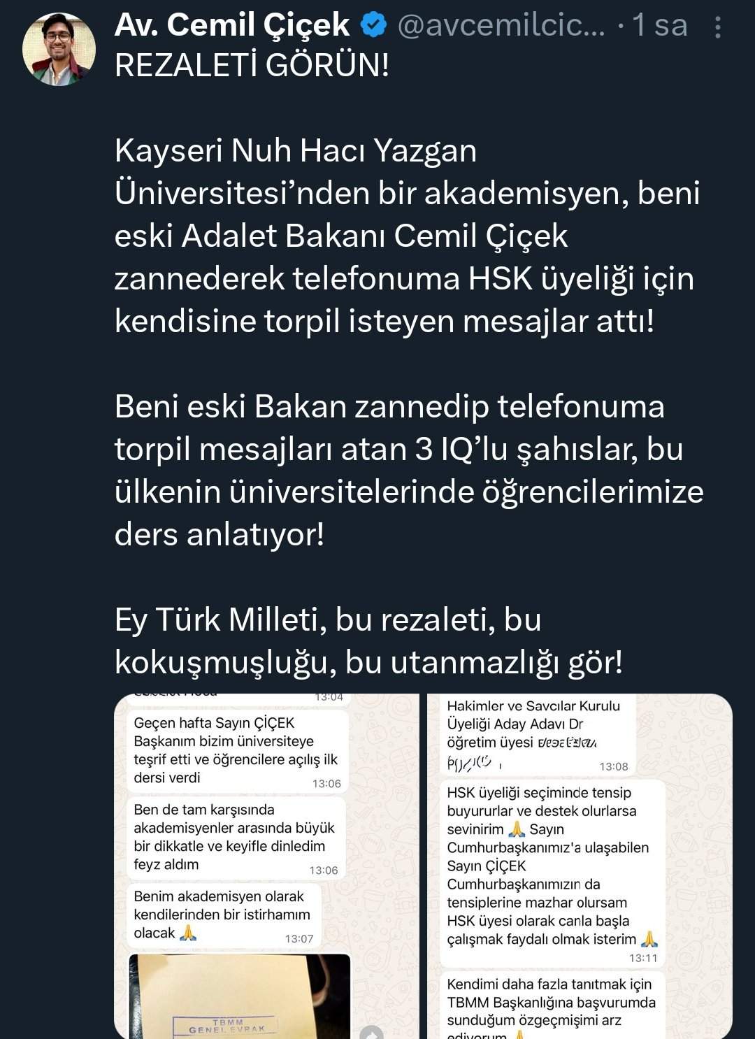 Avukat Cemil Çiçek’i eski Adalet Bakanı sanarak HSK üyeliği için torpil talep eden ve özgeçmişini gönderen akademisyen ülke gündemine otururken. avukat Çiçek akademisyenin mesajlarını sosyal medya hesabından paylaştı.