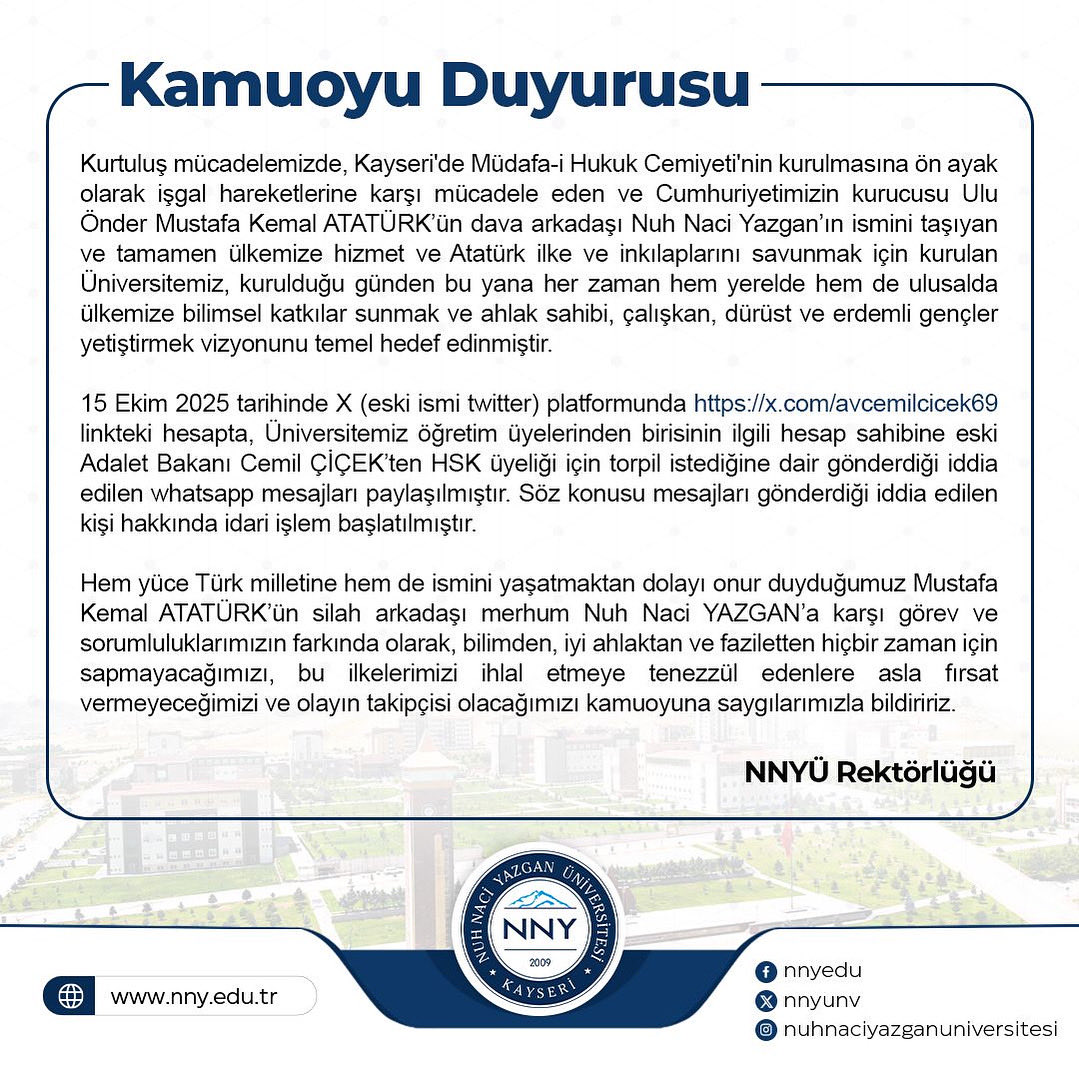 Nuh Naci Yazgan Üniversitesi'ndeki görevli bir akademisyenin HSK üyeliği için eski Adalet Bakanı Cemil Çiçek yerine aynı isimli avukata attığı mesajlar sosyal medyada paylaşılmış ve ülke gündemine oturmuştu.