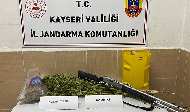 Kayseri İl Jandarma Komutanlığı İstihbarat Şube Müdürlüğü ve Özvatan İlçe Jandarma Komutanlığınca yapılan çalışmalarda; A.K. isimli şahsın yasadışı kenevir ekimi yaptığı bilgisi elde edilmesi üzerine yapılan aramada bin 690 gram Kubar Esrar, 1 adet ruhsatsız av tüfeği ele geçirildi.