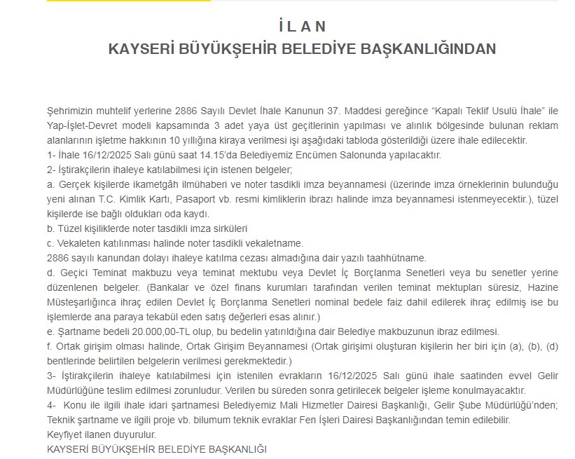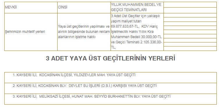 Kayseri Büyükşehir Belediyesi, Seyyid Burhaneddin ve 2 mevkiye yaya üst geçidi yapımı için ihaleye çıkıyor.Yıldızevler, DSİ ve Seyyid Burhaneddin Bulvarlarına yapılacak üst geçitler yapımı ve reklam alanlarının 10 yıllığına kiralanması için yapılacak ihalenin detayları şöyle;
