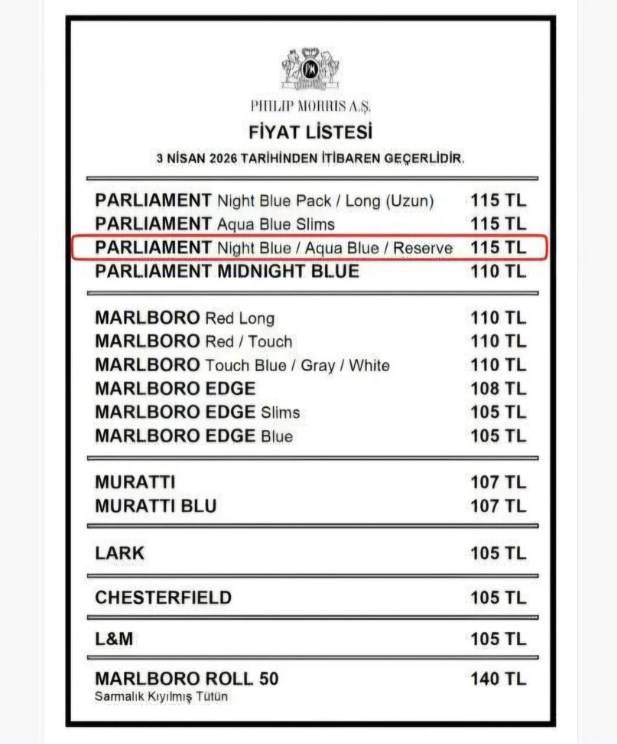 Tekel Bayileri Platform Başkanı Özgür Aybaş, Philip Morris grubundaki Parliament Night Blue, Aqua Blue ve Reserve grubunun fiyatına 5 TL zam geldiğini açıkladı.