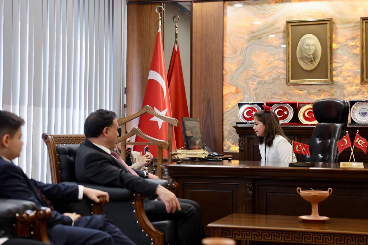 Vali Gökmen Çiçek, 23 Nisan Ulusal Egemenlik ve Çocuk Bayramı ile Türkiye Büyük Millet Meclisi’nin açılışının 106. yıl dönümü sebebiyle makamında İl Milli Eğitim Müdürü Coşkun Esen ve beraberinde Talas ilçesi TOKİ Şehit Levent Çetinkaya İlkokulu öğretmen ve öğrencilerini makamında kabul etti. Valilik koltuğuna oturan Zeynep Gedikbaş, “Sayın Valim, öncelikle bizleri makamınızda kabul ettiğiniz için şahsım ve arkadaşlarım adına çok teşekkür ediyorum. Bugün burada bulunmak, ilimizin en üst yöneticisiyle tanışmak bizler için büyük bir onur ve heyecan kaynağı. Bizler Cumhuriyetimizin emanetçisi olan öğrenciler olarak, vatanına ve milletine bağlı bireyler olarak yetişmek için çalışıyoruz. Şehrimizde göreve başladığınız günden bu yana himayenizde yürütülen çalışmaları büyük bir heyecanla takip ediyoruz. Kadın kooperatiflerinden Soğanlı Vadisi’nin turizme kazandırılmasına, gençlere yeni imkânlar sunan ERVA spor kulüplerine kadar her bir adım bizleri heyecanlandırıyor” dedi.