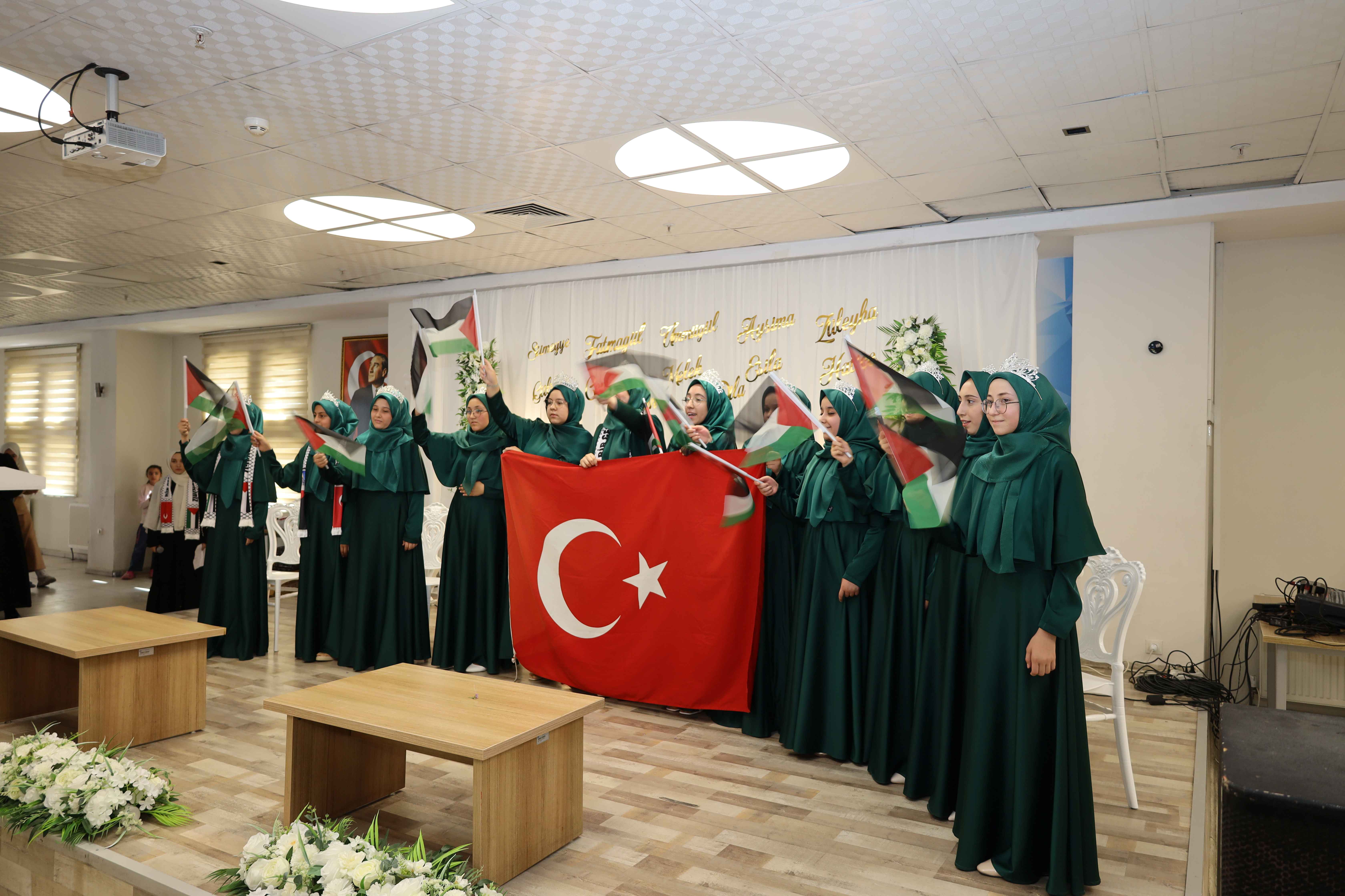 Program, saygı duruşu ve İstiklal Marşı’nın okunmasıyla başladı. Ardından Kur’an-ı Kerim tilaveti ile manevi atmosfer güçlendi. Öğrenciler, ilahiler seslendirerek dinleyicilere duygulu anlar yaşattı. Hafızlar, merasimde Filistin halkına destek mesajları vererek dualar etti.