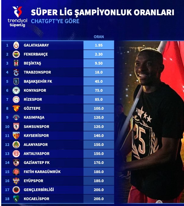 Chat GPT uygulamasından faydalanılarak yapılan araştırmada Trendyol Süper Lig'in 2025-2026 sezonunda Galatasaray şampiyonluğa ulaşacak. Bu takımın arkasından ise Fenerbahçe gelecek.