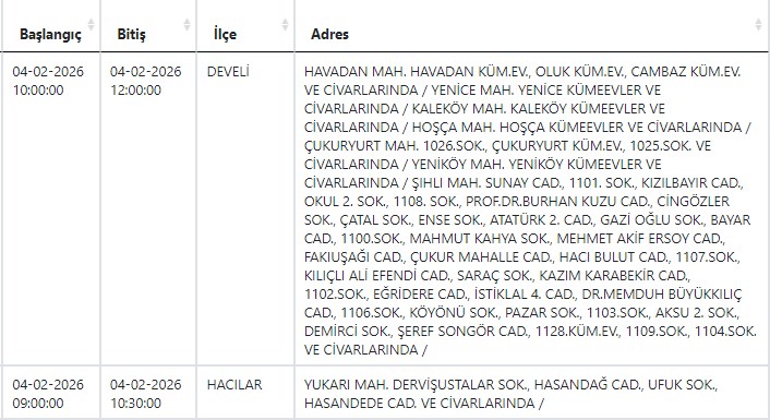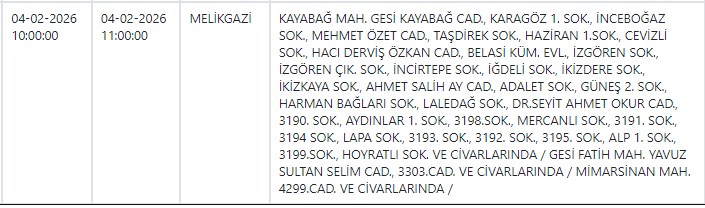 Kayseri ve Civarı Elektrik Türk Anonim Şirketi (KCETAŞ), vatandaşları yaşanacak elektrik kesintilerine ilişkin uyardı. Buna göre yarın (4 Şubat) Melikgazi, Hacılarve Develi'nin bazı mahallelerinde elektrik kesintisi yaşanacak.