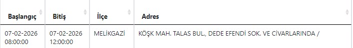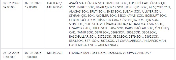 Buna göre yarın (7 Şubat) Melikgazi ve Hacılar'ın bazı mahallelerinde elektrik kesintisi yaşanacak.