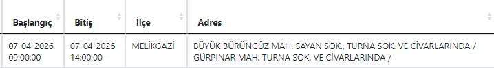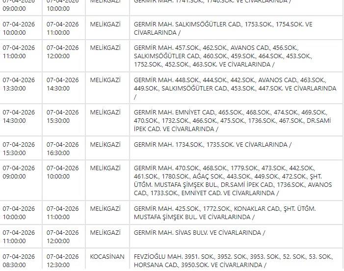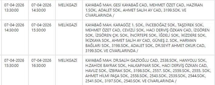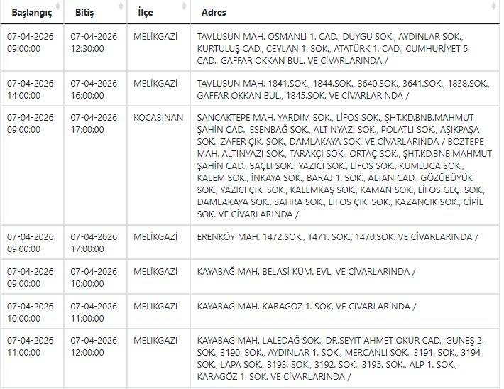 Buna göre yarın (7 Nisan) Melikgazi ve Kocasinan ilçelerinde elektrik kesintisi yaşanacak.