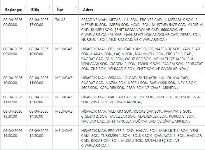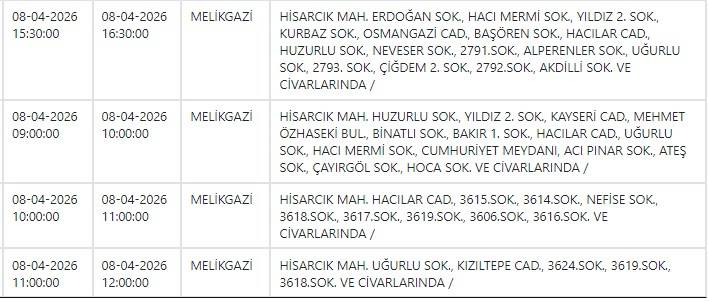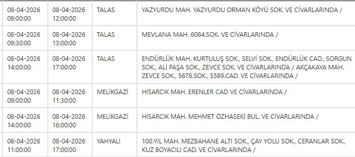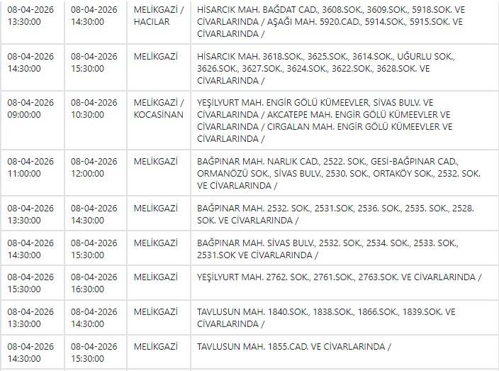 Kayseri ve Civarı Elektrik Türk Anonim Şirketi (KCETAŞ), vatandaşları yaşanacak elektrik kesintilerine ilişkin uyardı. Buna göre yarın (8 Nisan) bir çok ilçede elektrik kesintisi yaşanacak.