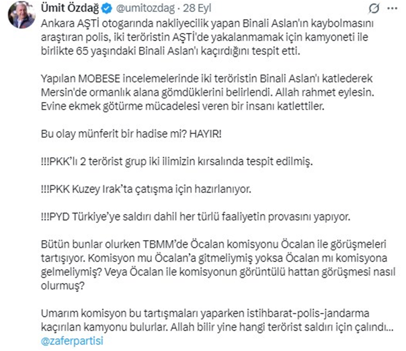 İlk olarak da söylediğimiz gibi her şeyi unutup Sayın Özdağ'ın son fecaatine bakalım. AŞTİ'de aracıyla yolcu taşımacılığı yapan bir minibüs şoförü kaçırılarak öldürüldü. Merhumun Mersin'de gömüldüğü, aracının ise kimliği belirsiz kişilerce kaçırıldığı öğrenildi. Ardından Özdağ, aşağıdaki paylaşımı yaptı;