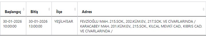 Kayseri ve Civarı Elektrik Türk Anonim Şirketi (KCETAŞ), vatandaşları yaşanacak elektrik kesintilerine ilişkin uyardı. Buna göre yarın (30 Ocak) Yeşilhisar'da elektrik kesintisi yaşanacak.