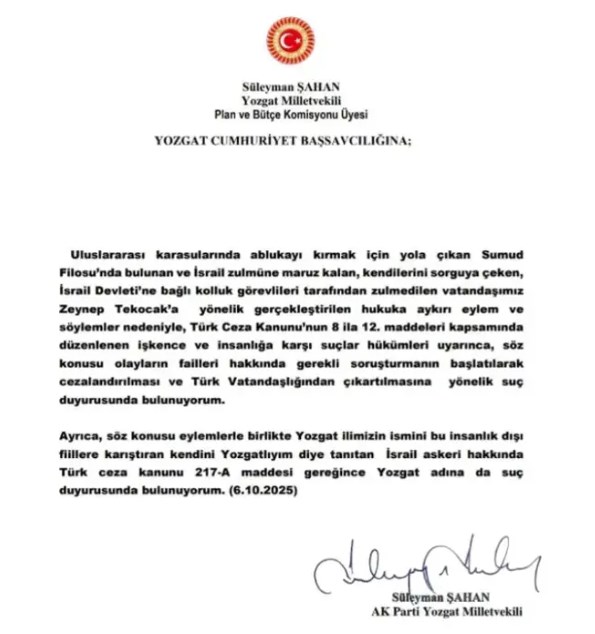 Ak Parti Yozgat Milletvekili Süleyman Şahan, "Yozgatlıyım" diyen İsrail polisi hakkında suç duyurusunda bulunduğunu duyurdu. Şahan, sosyal medya hesabı üzerinden yaptığı açıklamada, Zeynep Tekocak'a yönelik eylemler nedeniyle TCK 8-12'nci maddeler kapsamında failler hakkında suç duyurusunda bulunduğunu ifade etti ve "Ayrıca bu utanç verici eylemlerle Yozgat'ın adını kirletmeye cüret eden, kendini 'Yozgatlıyım' diye tanıtan İsrail askeri hakkında da TCK 217/A maddesi gereğince Yozgat ve tüm Yozgatlı hemşehrilerim adına suç duyurusunda bulundum" ifadelerine yer verdi.
